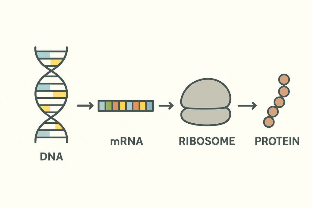 Die genetische Information ist in der DNA abgelegt. Diese liegt im Zellkern in Form von Chromosomen dicht gepackt vor. Die DNA ist der Träger aller Gene. Es ist aber immer nur eine Auswahl von Genen aktiv. Gene tragen Informationen zur Herstellung von Proteinen. Gene für benötigte Proteine werden aktiviert. Dabei wird die Information von der DNA ausgelesen und auf eine mRNA übertragen. Sie stellt sozusagen eine Blaupause für die Herstellung von Proteinen dar. Sie wird aus dem Zellkern in das Zytoplasma der Zelle transportiert, dort an Ribosomen abgelesen und das gewünschte Protein hergestellt (Bild 1).