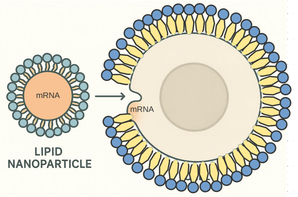 Bei einer mRNA Impfung ist der Impfstoff in Lipid-Nanopartikel verpackt. Die Hülle eines solchen Nanopartikels ähnelt im Aufbau den Zellmembranen unserer Körperzellen. Die Nanopartikel verschmelzen nach Injektion mit unseren Körperzellen (Bild 2). Dabei entlassen sie ihren Inhalt, im diesem Falle also die mRNA, in das Zytosol.